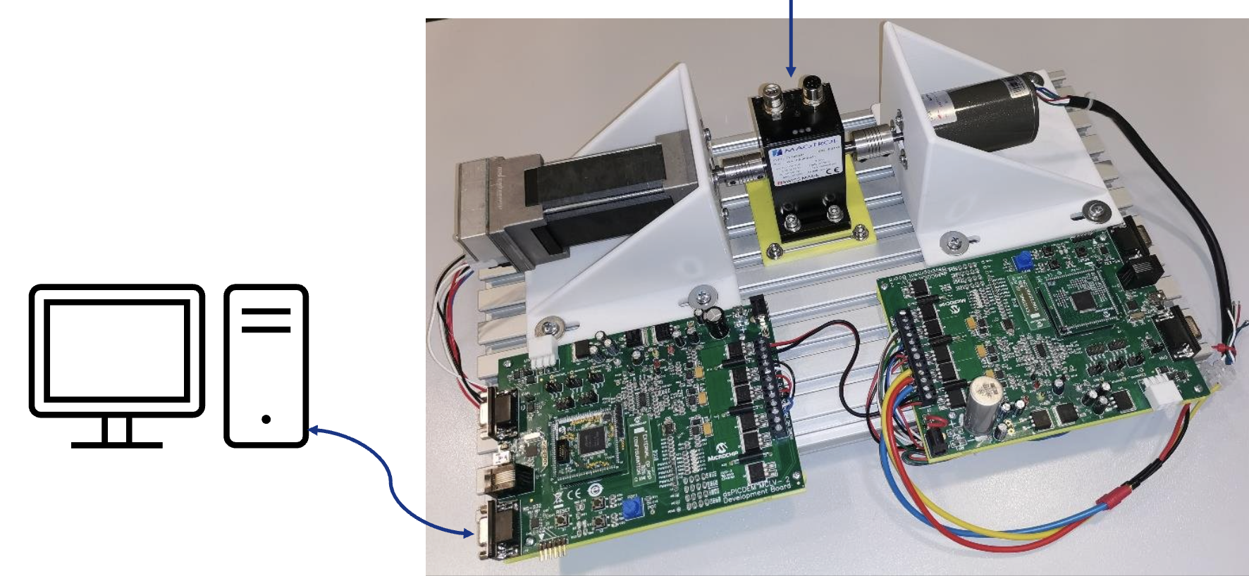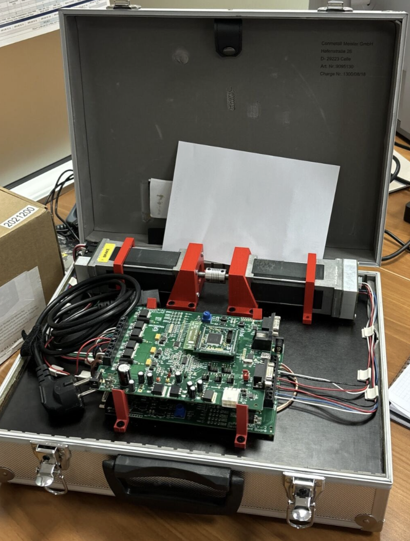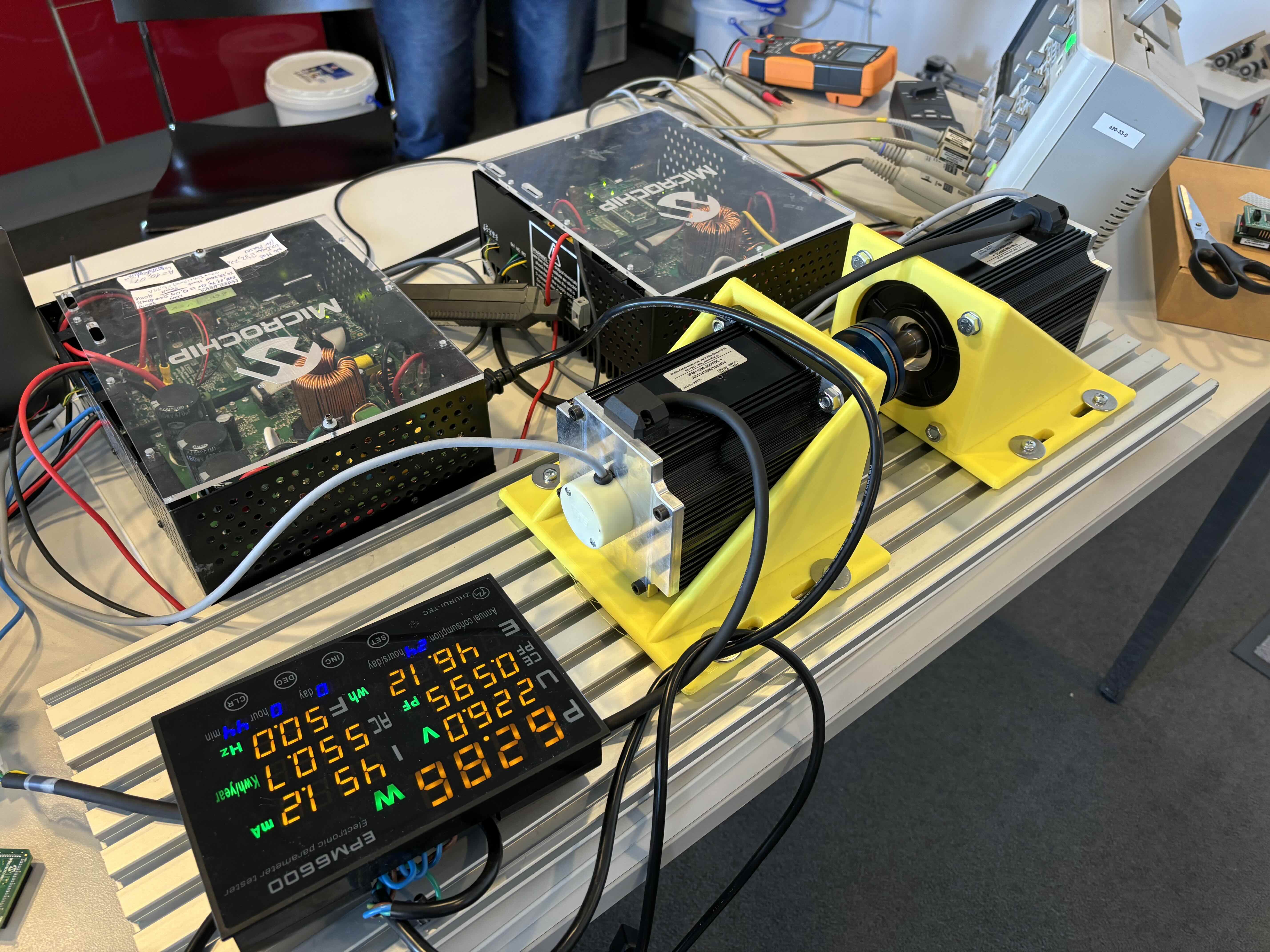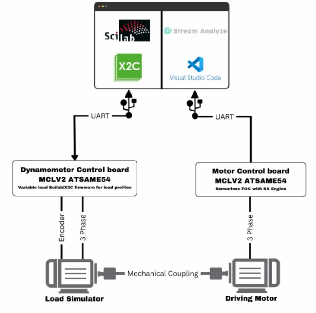 “Dyno” is short for dynamometer. In this project the dyno is implemented using a PMSM motor which must have an encoder. This motor is connected to a control board running the MC-Dyno software, and the control board, is connected to a PC running Scilab/XCOS or external an controller (for example the IGAT) for interfacing with it. In a motor-dyno setup, the motor is the device that produces mechanical power, while the dyno is the machine that absorbs mechanical power and measures the motor’s performance. Using this configuration you can apply a controllable mechanical load to the motor-under-test and observe its response (torque, speed, power, efficiency, thermal behavior, etc.). For basic characterization a dedicated torque sensor is not required. Because the dyno is “smart” (motor-as-brake), you can simulate different load profiles and dynamic conditions, enabling more meaningful testing than with simple passive loads.
