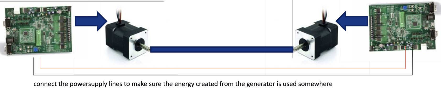 To avoid the Dynamometer to destroy itself, it’s mandatory to have a power sink for the DC-link voltage. Best way is to connect both DC link boards together. If you are doing a default MC-Dyno configuration, only use one power supply and then connect the two boards together to share the power from the power supply, this will allow for sink of exceeding power in the motor that requires energy and keep the DC-Link voltage regulated.