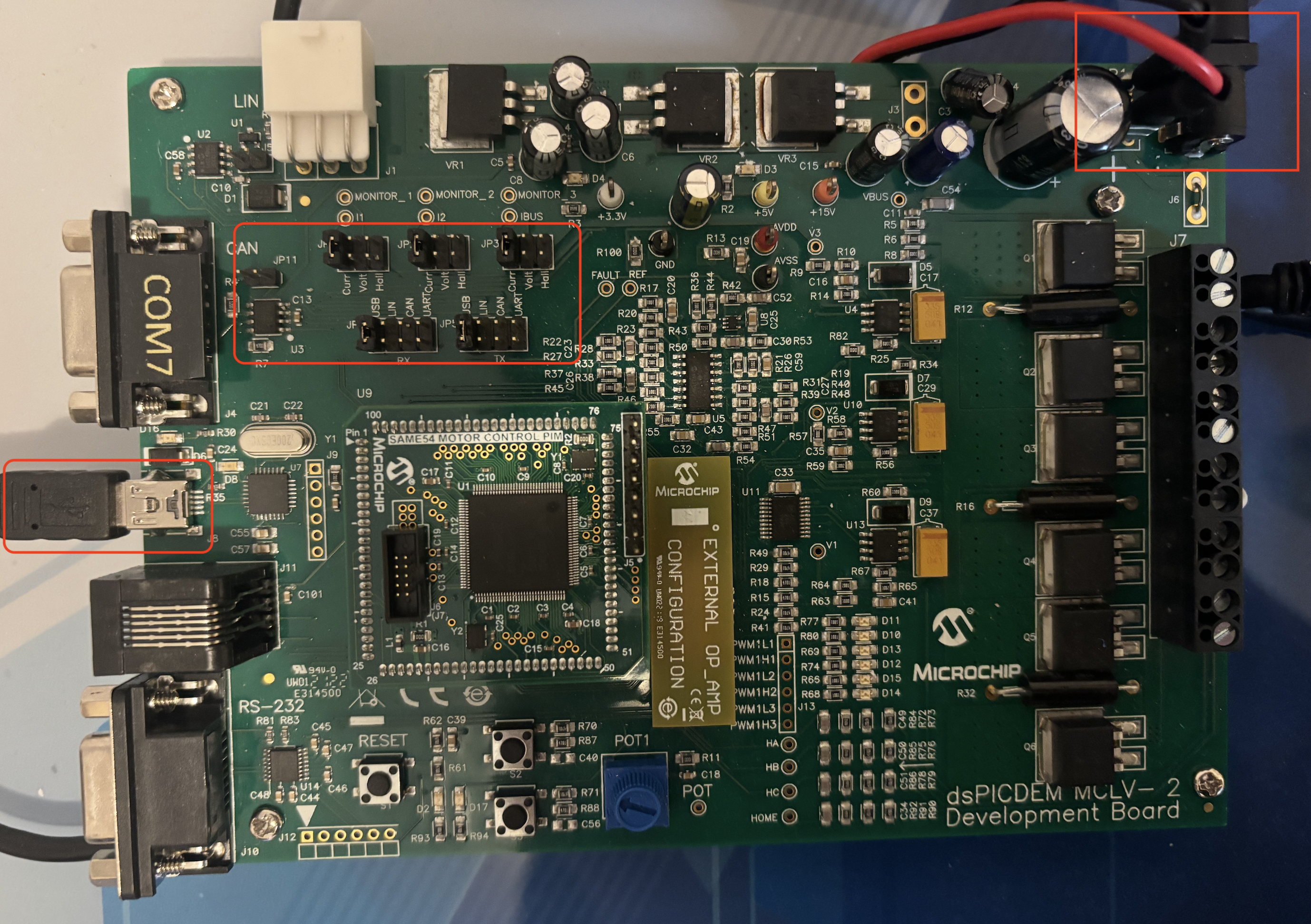 For the MCLV-2 you will need the ATSAM54P20A External OpAmp PIM board. Other than that you will need to configure the board like shown in the picture below (make sure all jumpers in your board are placed in the same way as in the reference picture):